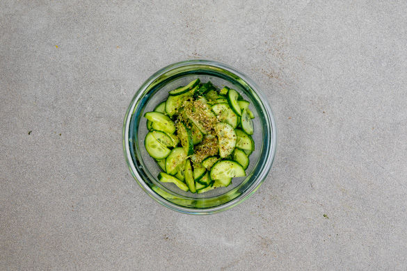 Die Gurke längs halbieren, in feine Scheiben schneiden oder hobeln, mit 2–3TL Öl und 1–2TL Essig vermengen und mit 1 Prise Zucker, Salz, Pfeffer und dem restlichen Oregano abschmecken. Den Gurkensalat zum Moussaka-Auflauf servieren.
