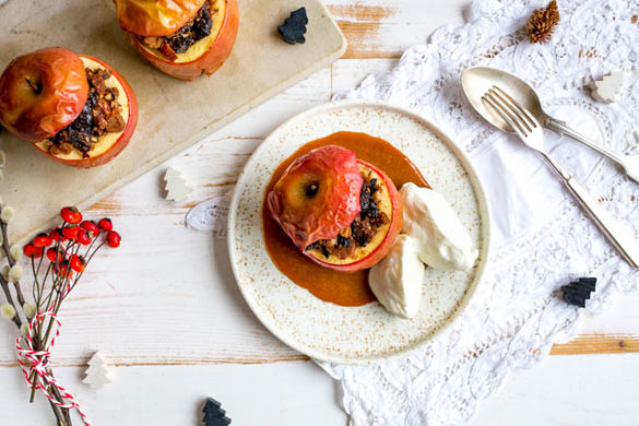 Ein feiner Bratapfel gehört mit zum Besten, was der Winter zu bieten hat. Gefüllt mit zerbröseltem Spekulatiusgebäck, Pflaumen und Haselnüssen und serviert mit einer heißen Salzkaramellsauce sowie geschlagener Sahne mit Vanille könnte dies der köstlichste Bratapfel sein, denn du jemals probiert hast! Als gut vorzubereitendes Dessert für Klein und Groß können wir ihn auch für dein Weihnachtsmenü wärmstens empfehlen!