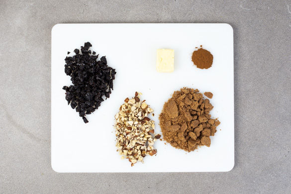 Den Spekulatius zerkleinern. Das geht am besten, indem du die Kekse in einen Gefrierbeutel gibst und mit einem Fleischklopfer oder einer schweren Pfanne zerbröselst. Die Haselnüsse und die getrockneten Pflaumen grob hacken und mit dem Spekulatius, 1 Prise Zimt und der 1/2 der Butter gut vermengen.