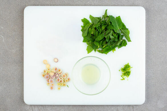 Die oberen 3cm des Zitronengrases entfernen, das übrige Zitronengras in feine Scheiben schneiden. Die Minzeblätter von den Stängeln zupfen und grob zerteilen. Die Limettenschalen abreiben, dann die Limetten halbieren und auspressen.