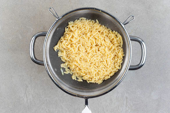 In einem großen Topf ausreichend gesalzenes Wasser für die Pasta zum Kochen bringen. Die Pasta in das kochende Wasser geben und in 10–12Min. bissfest kochen. In ein Sieb abgießen, mit kaltem Wasser abschrecken und abtropfen lassen.