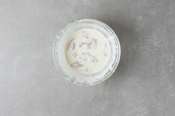 Die ½ der Gewürzmischung, 2TL Backpulver, 200g Mehl und 300ml lauwarmes Wasser mit einem Schneebesen zu einem zähflüssigen Teig verrühren und mit je 1 kräftigen Prise Salz und Pfeffer würzen. Das Fleisch trocken tupfen und in fingerlange Streifen schneiden.