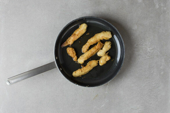Eine große Pfanne ca. 1cm hoch mit Pflanzenöl befüllen und dieses bei mittlerer Hitze erwärmen. Tipp: Um zu testen, ob das Öl heiß genug ist, einen Tropfen Teig hineingeben. Ist das Öl heiß genug, wird es sofort sprudeln. Das Fleisch durch den Teig ziehen, bis es gleichmäßig bedeckt ist.