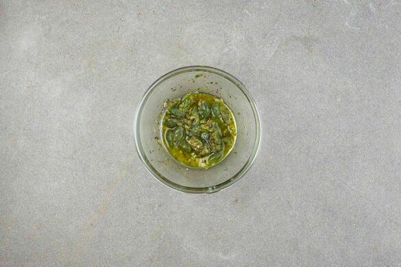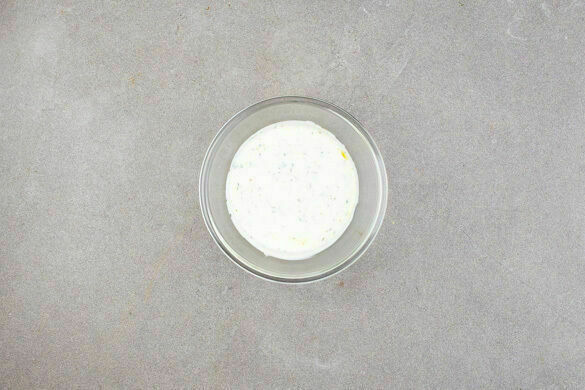 Die Minzeblätter von den Stängeln zupfen und fein schneiden. Den Joghurt mit der Minze und dem restlichen Knoblauch verrühren und mit Salz und Pfeffer abschmecken.
