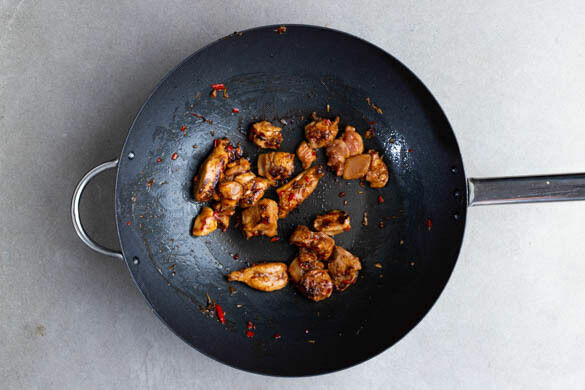 Das Fleisch in einer großen Pfanne oder einem Wok mit 2EL Pflanzenöl bei mittlerer Hitze 2–3Min. goldbraun anbraten. Auf einem Teller beiseitestellen, die Pfanne auswischen.