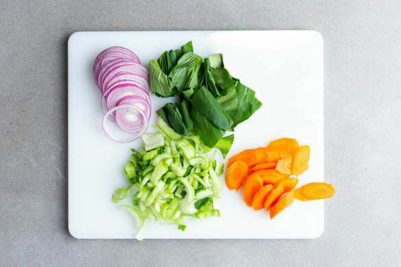 Die Zwiebel schälen und in dünne Ringe schneiden. Den weißen Teil des Pak Choi in dünne Streifen schneiden, den grünen Teil grob zerschneiden. Die Karotten ggf. schälen und in dünne Scheiben schneiden.