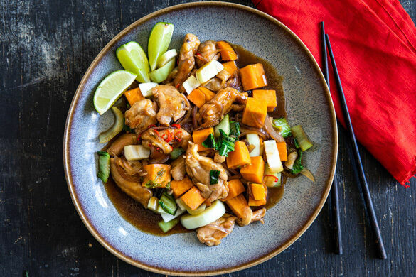 Wir haben es mal wieder geschafft: Wir bringen authentische Thai-Küche zu dir nach Hause und zwar ohne großen Aufwand, aber dafür mit extra viel „Mmmh“! In deiner Pfanne brätst du erst das zarte Hähnchenschenkelfilet an, dann gesellen sich Süßkartoffelwürfel, Knoblauch und Pak Choi dazu. Für die richtige Würze sorgen Soja- und Fischsauce. Feine Chilistreifen, Thai-Basilikum und Limette machen das Gaumenglück komplett!