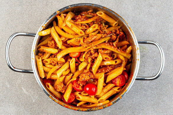 Den Fenchel, den Knoblauch und die ½ des Tomatenmarks zu dem Hackfleisch geben und ca. 1Min. mitbraten, bis das Tomatenmark etwas am Boden ansetzt. 200ml Wasser, ½TL Salz und ½TL Zucker dazugeben und alles bei mittlerer Hitze 9–10Min. köcheln lassen, bis der Fenchel gar und die Sauce eingedickt ist. Ggf. mehr Wasser zugeben und mit Salz und Pfeffer abschmecken.
