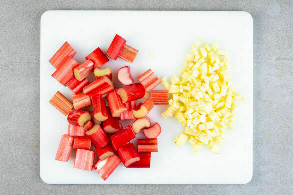 220ml Milch mit 1EL hellem Essig verrühren und beiseitestellen. Die Äpfel schälen, entkernen und fein würfeln. Den Rhabarber in 2–3cm große Stücke schneiden.