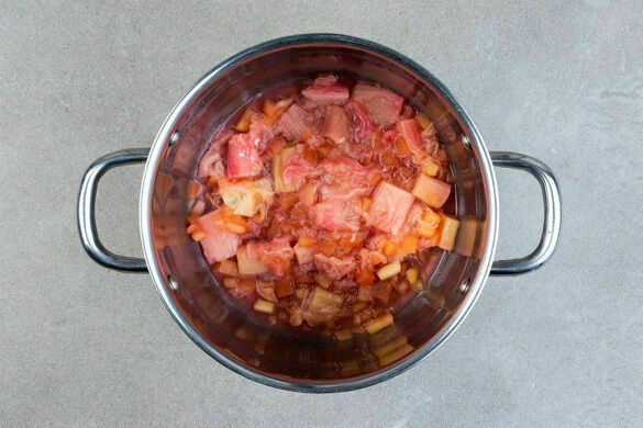 Die Apfel- und Rhabarberstücke in einen großen Topf geben, 100g Zucker unterrühren und bei mittlerer Hitze 10–12Min. köcheln lassen, bis die Äpfel weich sind und der Rhabarber zerfällt. Ggf. etwas Wasser hinzufügen, damit der Rhabarber nicht anbrennt.