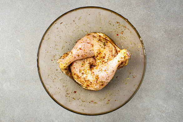 Außen knusprig, innen saftig – das sind unsere köstlichen Hähnchenschenkel, die vor ihrer Wärmebehandlung im Ofen in einer aromatischen Gewürzmischung aus Oregano, Thymian und Rosmarin entspannen. Ein raffinierter Salat aus Karotten, Zucchini und geröstetem Brot mit Knoblauch bringt willkommene Abwechslung auf den Tisch. Dazu gibt es einen erfrischenden Joghurtdip mit Petersilie. Mmmh!