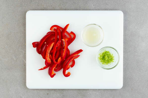 In einem kleinen Topf 300ml leicht gesalzenes Wasser für den Reis zum Kochen bringen. Die Enden der Bohnen entfernen und die Bohnen quer halbieren. Die Paprika halbieren, entkernen und in feine Streifen schneiden. Die Limettenschale abreiben, dann die Limette halbieren und auspressen.