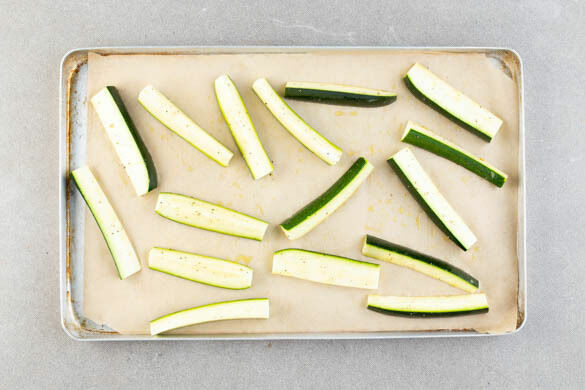 Den Backofen auf 240°C (220°C Umluft) vorheizen. In einem mittelgroßen Topf 500ml Wasser für die Kartoffeln zum Kochen bringen. Die Zucchini der Länge nach in pommesartige Stifte schneiden. Auf einem mit Backpapier ausgelegten Backblech mit 1EL Olivenöl, der ½ der Gewürzmischung, 1 kräftigen Prise Salz und 1 Prise Pfeffer vermengen und 15–20Min. im Ofen backen.