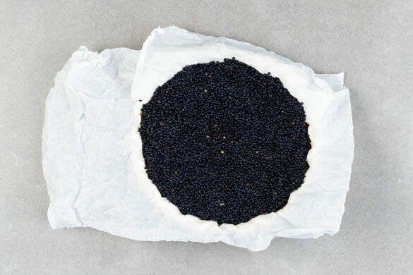 Mit einer Gabel Löcher in den Boden und die Seiten des Teigs stechen. Das Backpapier über den Teig legen. Ggf. mehr Backpapier verwenden, sodass der gesamte Teig bedeckt ist. Die Quicheform mit dem Backgewicht befüllen. Tipp: Die Ränder mit dem Backgewicht stabilisieren, damit sie beim Backen nicht zusammenfallen.