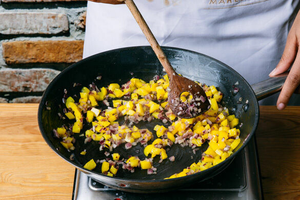 Die Paprika und die Zwiebeln in derselben Pfanne mit 2TL Olivenöl bei mittlerer Hitze 3–5Min. anbraten, mit Salz und Pfeffer abschmecken. Währenddessen die Zitronenschale abreiben und die Zitrone halbieren, eine Hälfte auspressen, die andere Hälfte in Spalten schneiden.
