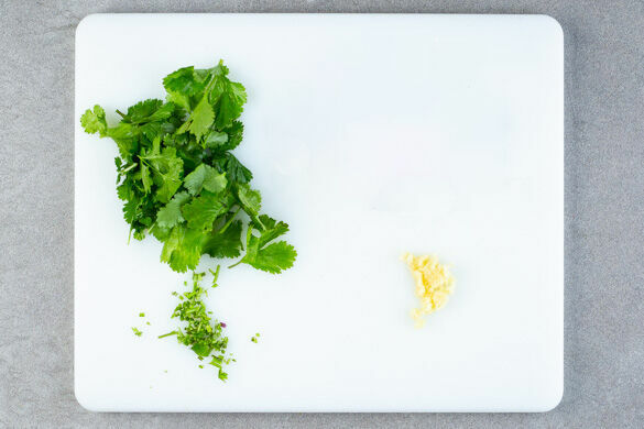 Den Knoblauch schälen und fein würfeln. Die Korianderblätter von den Stängeln zupfen. Die Korianderstängel fein schneiden, die Blätter für später beiseitelegen.