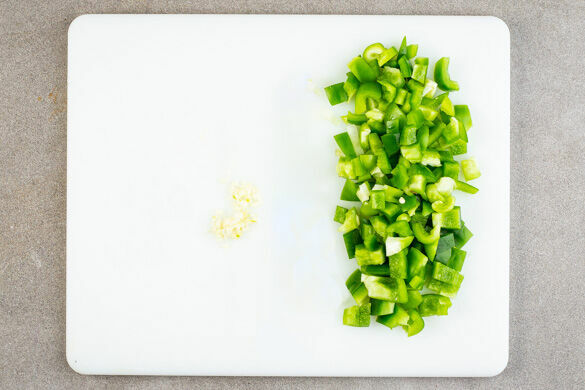 Die Paprika vierteln, entkernen und in 1–2cm große Würfel schneiden. Den Knoblauch schälen und ebenfalls grob würfeln.