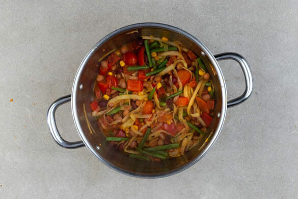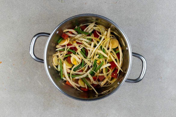 Die Chorizo und den Knoblauch in einem großen Topf mit 2EL Olivenöl bei mittlerer bis starker Hitze ca. 1Min. anbraten. Den Gemüsemix unterheben und ca. 2Min. mitbraten. Das Gemüse mit dem Paprikapulver bestreuen und ca. 1Min. weiterbraten.