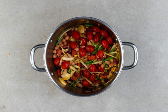 Die Bohnen in einem Sieb mit kaltem Wasser abspülen und abtropfen lassen. Die Kirschtomaten und die Bohnen mit 300ml Wasser und 1TL Salz in den Topf rühren und abgedeckt aufkochen, dann bei mittlerer Hitze ca. 4Min. köcheln lassen.