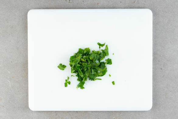 In einem mittelgroßen Topf 600ml leicht gesalzenes Wasser für den Couscous zum Kochen bringen. Den Knoblauch schälen und sehr fein würfeln oder durch eine Knoblauchpresse drücken.