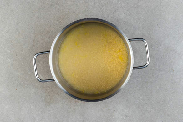 In einem mittelgroßen Topf 600ml leicht gesalzenes Wasser zum Kochen bringen, dann 2TL Zitronenschale zugeben. Den Topf vom Herd nehmen, den Couscous in das kochende Wasser rühren und abgedeckt 6–8Min. quellen lassen. Den Couscous mit einer Gabel auflockern und mit 2TL Butter und ca. 2EL Zitronensaft verfeinern.