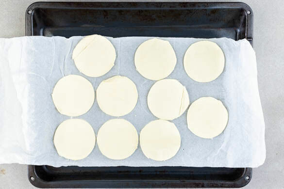 Die Teige mit dem Papier nach unten ausrollen. Mit einem Glas (ca. 8cm Ø) oder einer Plätzchenform Teigkreise ausstechen. Die Teigkreise auf dem Papier verteilen und auf ein Backblech legen, ggf. ein zweites Blech verwenden. Die Fleurons 8–10Min. im Ofen backen, bis sie goldbraun sind, ggf. die Position der Bleche nach der Hälfte der Zeit tauschen.