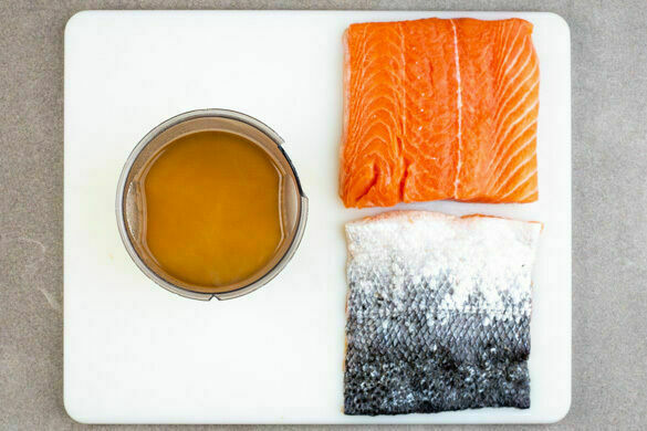 Das Brühgewürz in 1L heißem Wasser auflösen. Den Fisch mit kaltem Wasser abspülen, trocken tupfen und mit einem scharfen Messer von der Haut befreien. Evtl. vorhandene Gräten entfernen.