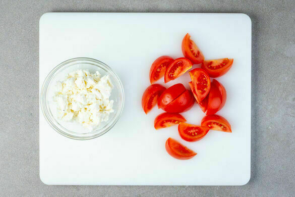Den Feta mit den Fingern oder einer Gabel zerkrümeln. Die Tomaten in Spalten schneiden.