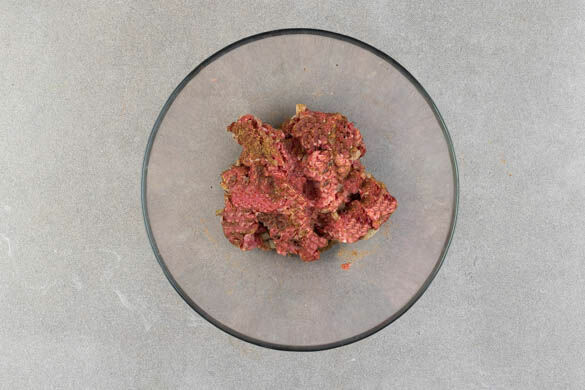 Den Knoblauch schälen und sehr fein würfeln oder durch eine Knoblauchpresse drücken. Das Hackfleisch mit dem Knoblauch, der Gewürzmischung und je 1 kräftigen Prise Salz und Pfeffer verkneten.