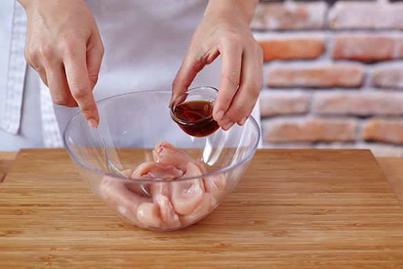 In einem großen Topf ausreichend leicht gesalzenes Wasser für die Nudeln zum Kochen bringen. Das Fleisch mit etwas Küchenkrepp trocken tupfen, in ca. 1–2cm breite Streifen schneiden, mit 2–3EL Sesamöl vermengen und beiseitestellen.