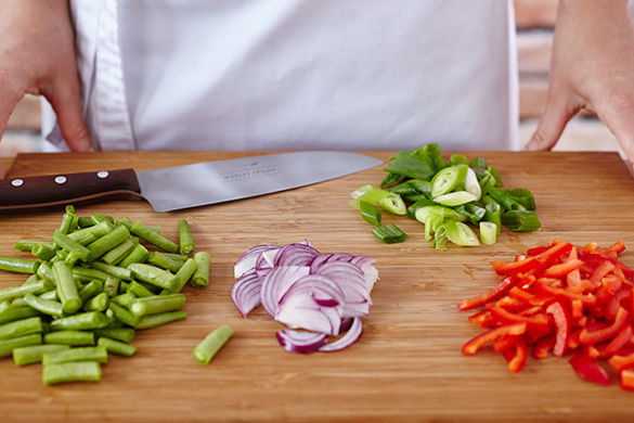 Die Paprika vierteln und entkernen, die roten Zwiebeln schälen und halbieren. Paprika und Zwiebeln in feine Streifen schneiden. Die Enden der Bohnen abschneiden und die Bohnen in ca. 2cm lange Stücke schneiden. Die Lauchzwiebeln in feine Ringe schneiden. Den Ingwer schälen und fein hacken.