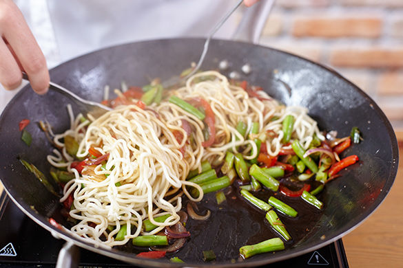 Das schmeckt uns! Es gibt knackig gebratenes Gemüse, das wir mit zarter Hühnchenbrust und asiatischen Mie-Nudeln anrichten. Kramt die Stäbchen raus und es kann losgehen!