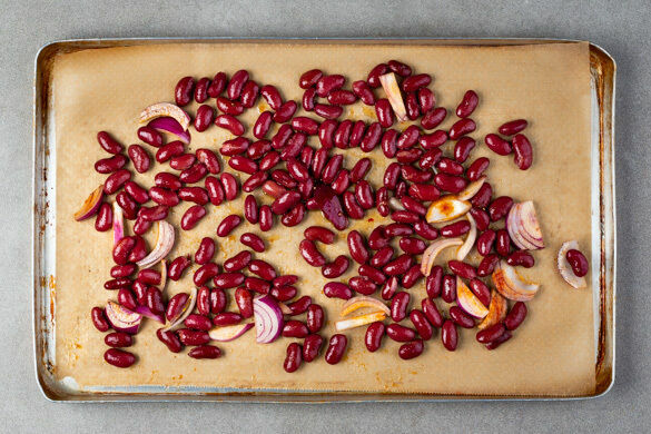 Die Limette halbieren und auspressen. Die Bohnen in einem Sieb mit kaltem Wasser abspülen, abtropfen lassen und mit der 1/2 der Zwiebeln sowie je 1 Prise Paprikapulver, Salz und Pfeffer vermengen. Auf einem mit Backpapier ausgelegten Backblech verteilen und 10–15Min. im Ofen backen.