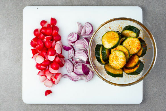 Den Backofen auf 190°C (170°C Umluft) vorheizen. Die Radieschen vierteln. Die Zwiebel schälen, halbieren und in dünne Spalten schneiden. Die Zucchini in 0,5–1cm dicke Scheiben schneiden und mit 1EL Pflanzenöl, 1/2TL Paprikapulver sowie je 1 Prise Salz und Pfeffer vermengen.