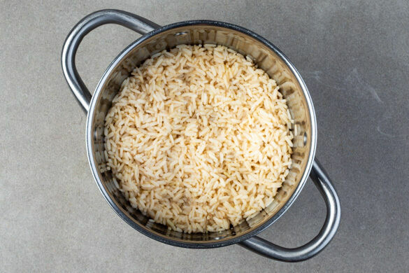 In einem kleinen Topf ausreichend leicht gesalzenes Wasser für den Reis zum Kochen bringen. Den Reis in das kochende Wasser geben und bei mittlerer Hitze in 8–10Min. bissfest kochen. Anschließend in ein Sieb abgießen und abtropfen lassen. Den Reis mit 1EL Limettensaft sowie je 1 Prise Salz und Pfeffer vermengen. Bis zum Servieren warm halten.
