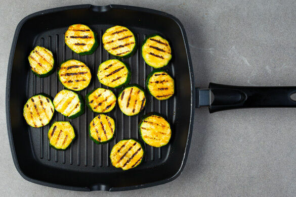 Die Zucchini in der Grillpfanne bei starker Hitze auf jeder Seite 3–4Min. grillen. Den Reis auf Schalen verteilen, die Bohnen, die Zucchini und die Radieschen darauf anrichten, die Salsa darüberträufeln und servieren.