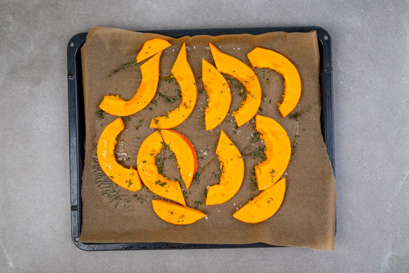 Den Kürbis halbieren, entkernen und in ca. 0,5cm breite Scheiben schneiden. Die Zitronenthymianblätter von den Zweigen streifen. Den Kürbis, den Thymian, 1EL Olivenöl, Salz und Pfeffer vermengen, dann den Kürbis auf einem mit Backpapier belegten Blech verteilen und im Ofen in ca. 15–25Min. knusprig backen. Tipp: Wer mag, kann die Thymianzweige mitbacken.