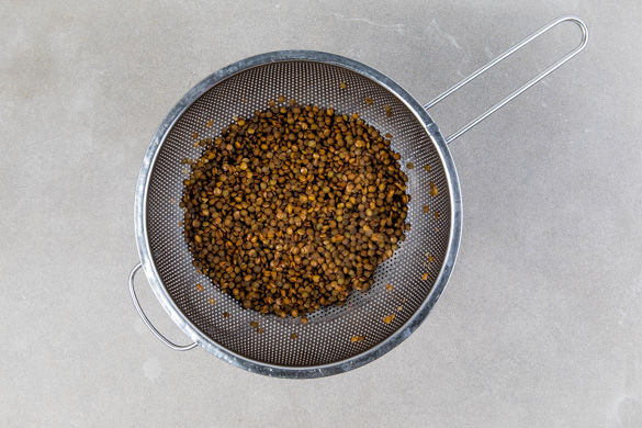 Den Backofen auf 200°C Umluft (220°C Ober-/Unterhitze) vorheizen. 1L Wasser in einem mittelgroßen Topf zum Kochen bringen. Die Linsen in einem Sieb abspülen. Sobald das Wasser kocht, die Linsen hineingeben, kurz aufkochen lassen, die Temperatur reduzieren und die Linsen abgedeckt in ca. 25–30Min. gar köcheln lassen. In ein Sieb abgießen und leicht salzen.