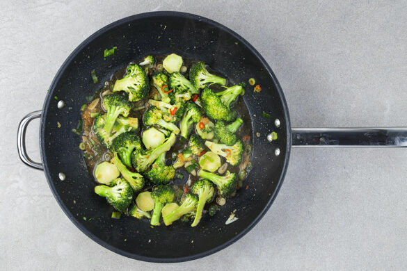 Den Knoblauch, den Ingwer und die Peperoni in der Pfanne bei mittlerer bis starker Hitze ca. 1Min. anbraten. Den Brokkoli und ¾ der Lauchzwiebeln zugeben und ca. 3Min. mitbraten, dann die Paprika zugeben und das Gemüse weitere 2Min. braten. Mit der Teriyaki-, der Sojasauce und 100–150ml Wasser ablöschen und mit Salz und Pfeffer würzen.