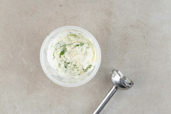 Die Dillspitzen abzupfen und fein schneiden. Den Feta mit dem Joghurt und 2TL Honig in einem hohen Gefäß mit einem Stabmixer cremig pürieren. Die ½ des Dills unterheben und die Fetacreme mit Salz und Pfeffer abschmecken.