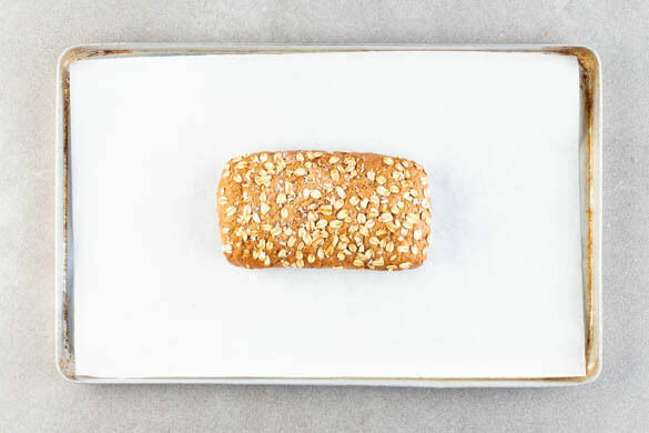 Das Brötchen auf einem mit Backpapier ausgelegten Backblech im Ofen 6–8Min. aufbacken. Währenddessen die Minzeblätter von den Stängeln zupfen und grob schneiden. Das Brötchen etwas abkühlen lassen, dann aufschneiden und jede Brötchenhälfte quer halbieren.