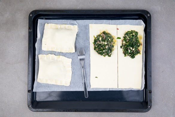 Den Teig mit dem Papier nach unten auf einem Backblech ausrollen und in 4 gleich große Streifen schneiden. Die Füllung jeweils auf einer Hälfte der Rechtecke verteilen, dabei überschüssige Flüssigkeit zurückhalten. Die Füllung mit der anderen Hälfte der Teigstücke bedecken, die Enden mit einer Gabel andrücken und gut verschließen.