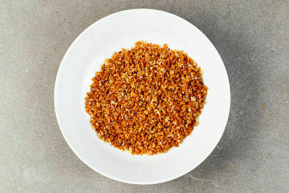 Das Panko-Paniermehl gleichmäßig auf einem mit Backpapier ausgelegten Backblech verteilen und 2–4Min. goldbraun rösten. Den Käse fein reiben und auf einem Teller mit dem Paniermehl, der Gewürzmischung, 2EL Olivenöl und ½TL Salz vermengen.