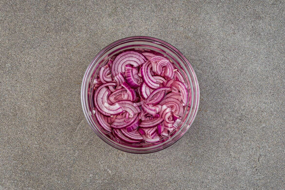 Die Zwiebeln schälen, halbieren und in feine Streifen schneiden. 4EL Essig mit 4EL Wasser, 1TL Zucker und 1 kräftigen Prise Salz verrühren, bis sich der Zucker und das Salz aufgelöst haben. Mit den Zwiebeln vermengen und beiseitestellen.