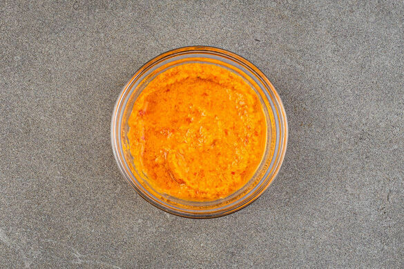 Die Tomaten vierteln und in einem hohen Gefäß mit 1EL Olivenöl, 2TL Essig, 1TL Gewürzmischung, 1 Prise Zucker und 1 Prise Salz pürieren.