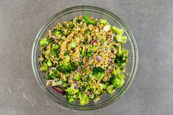 In einem großen Topf 1L Wasser mit ½TL Salz zum Kochen bringen. Den Brokkoli in ca. 2cm große Röschen schneiden, die Strünke ggf. schälen und in 1–2cm kleine Würfel schneiden. Den Bulgur in das kochende Wasser geben und ca. 5–7Min. kochen. In den letzten 3–4Min. den Brokkoli dazugeben und mitgaren. In einem feinmaschigen Sieb abtropfen und abkühlen lassen.