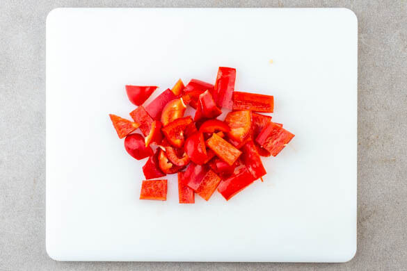 Inzwischen die Paprika vierteln, entkernen und in 1–2cm große Stücke schneiden.