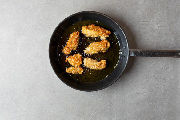 Auf einem tiefen Teller 4EL Mehl mit dem übrigen Currypulver, je 1 kräftigen Prise Salz und Pfeffer sowie 150ml Wasser zu einem glatten Teig verrühren. Auf einem zweiten Teller das Panko-Paniermehl mit dem Sesam vermengen. Das Fleisch trocken tupfen und in ca. 2cm breite Streifen schneiden, anschließend zum Panieren durch den Teig ziehen und im Panko-Sesam-Mix wenden.