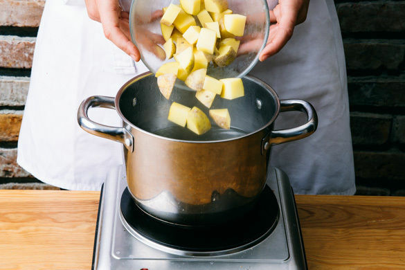 In einem mittelgroßen Topf ausreichend leicht gesalzenes Wasser für die Kartoffeln und die Bohnen aufsetzen. Die Kartoffeln ggf. schälen und in ca. 2cm große Würfel schneiden. Sobald das Wasser kocht, die Kartoffeln hineingeben und in 15–20Min. gar kochen.