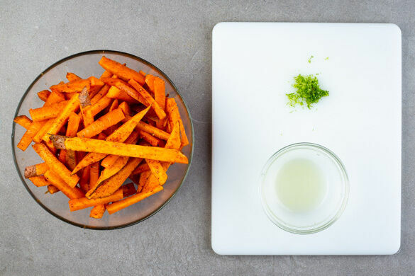 Den Backofen auf 220°C (200°C Umluft) vorheizen. Die Karotten ggf. schälen und in ca. 1cm breite Stifte schneiden. Die Süßkartoffeln samt Schale ebenfalls in ca. 1cm breite Stifte schneiden, mit den Karotten und 2EL Olivenöl vermengen und nach Belieben mit dem Paprikapulver sowie Salz und Pfeffer würzen. Die Limettenschale abreiben, die Limette halbieren und auspressen.